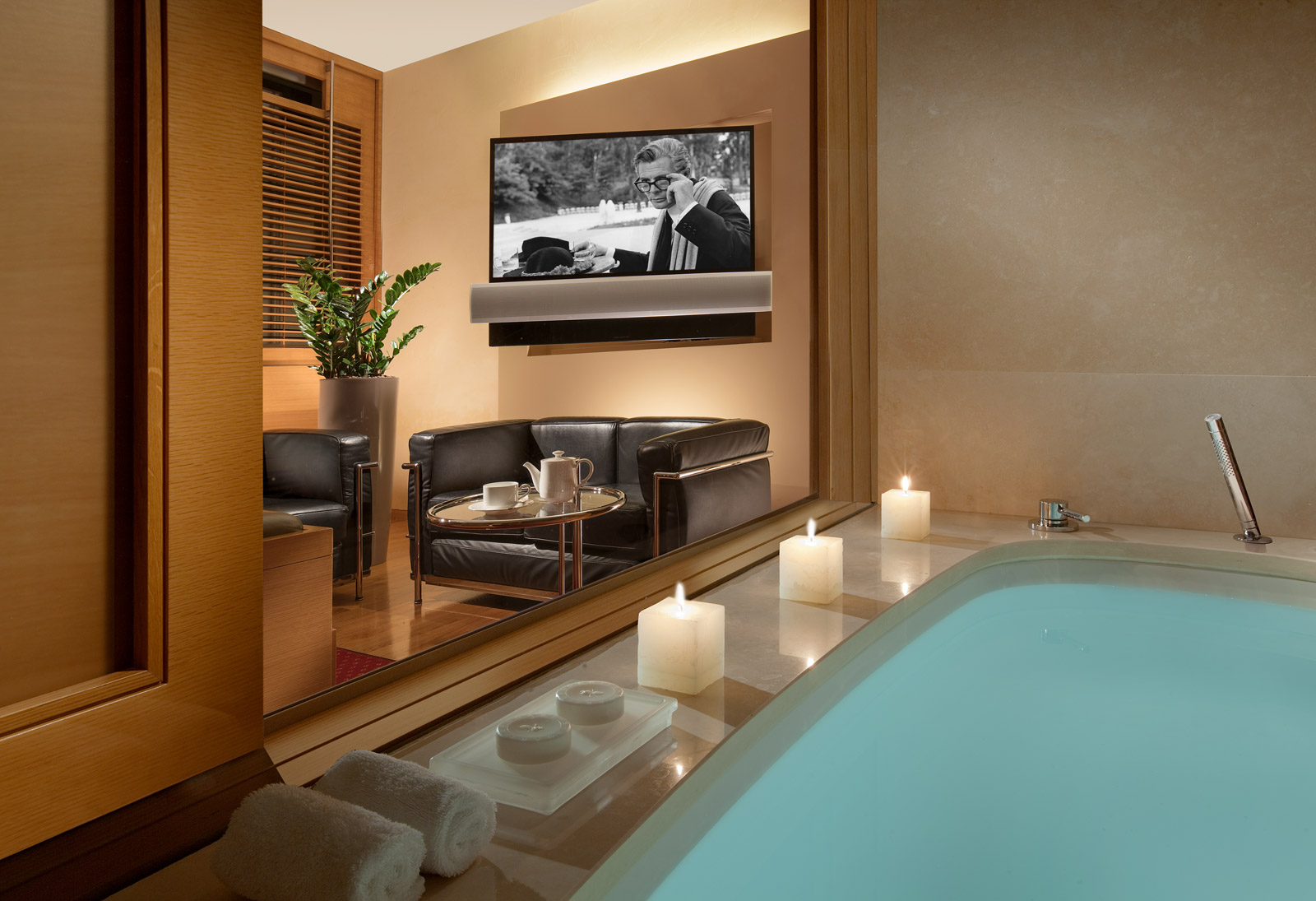 • Bathroom in Carrara statuary marble or Travertino Navona